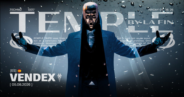 TEMPLE TAIPEI PRESENTS: VENDEX 🇪🇸 | 05.08.26 • 23:00 - 05:30 ⬛️ 西班牙硬派 Techno。快速、黑暗、極具衝擊力。從地下倉庫到歐洲舞池,聲音建立在高 BPM、失控張力與持續推進的節奏之上。 VENDEX 是來自西班牙的
